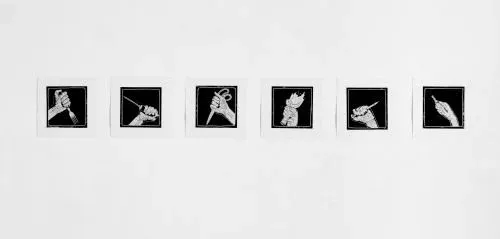 TITULO: seis objetos para defenderse. Técnica: linóleo