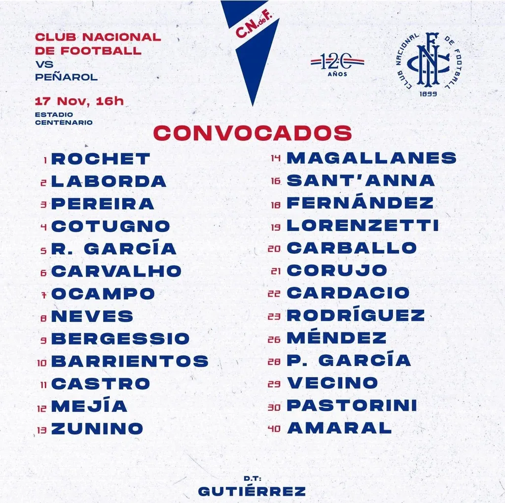 El técnico de Nacional, Álvaro Gutiérrez, no dejó a ninguno de los integrantes del plantel afuera de la concentración en la previa del clásico de este domingo a la hora 16 por la fecha 12 del torneo Clausura. Es una práctica que el club ya realizó en otras oportunidades.