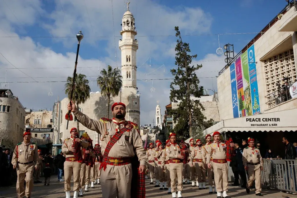 Una banda palestina se presenta en la plaza Manger frente a la Iglesia de la Natividad en la ciudad bíblica de Belén, Cisjordania.