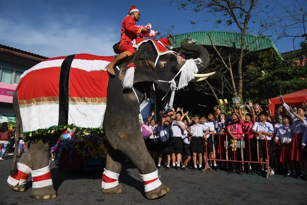 Un elefante vestido con un traje de Papá Noel con su mahout presenta juguetes y regalos a los escolares durante las celebraciones de Navidad en Ayutthaya, Tailandia.