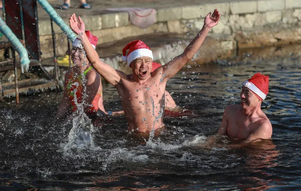 Los entusiastas de la natación de invierno que usan sombreros de Papá Noel nadan en un lago parcialmente congelado a temperaturas de menos 21 grados Celsius en el noreste de China.