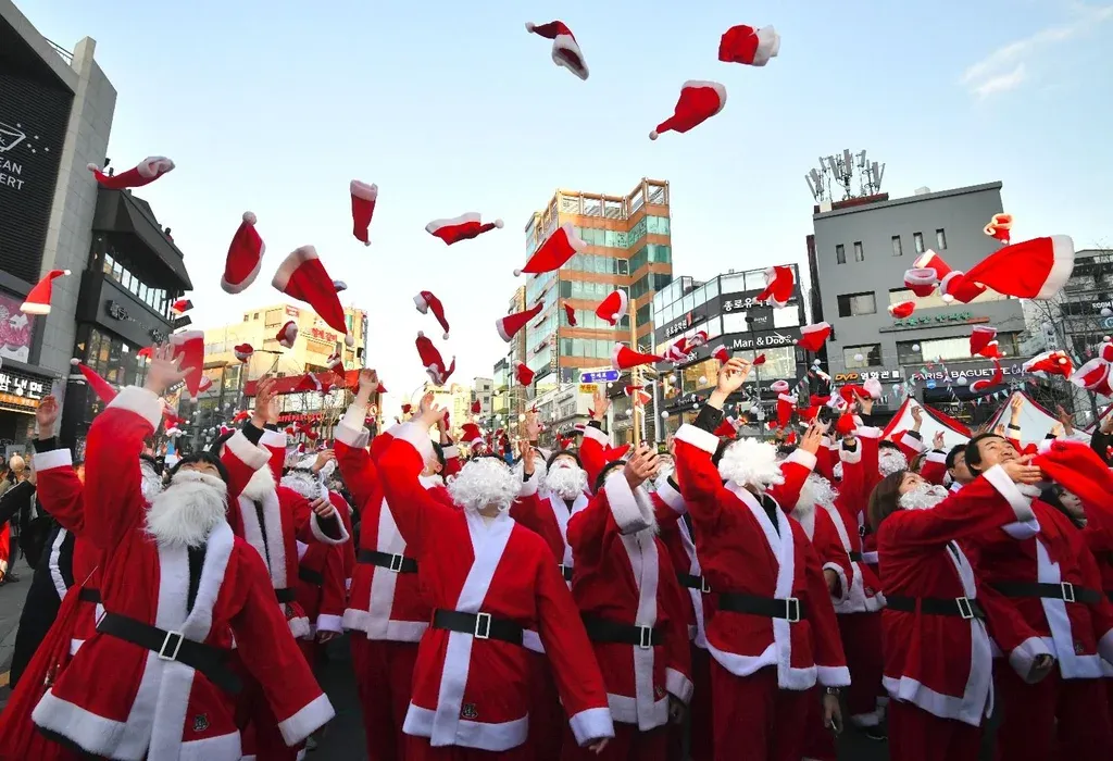 Voluntarios surcoreanos en trajes de Papá Noel le ponen sombreros a Santa durante una ceremonia antes de la entrega de regalos de Navidad en Seúl.