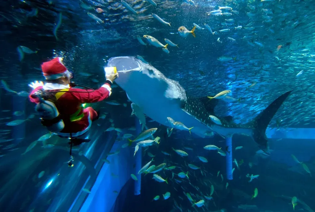 Un buzo vestido como Santa Claus nada con peces y un tiburón ballena en un acuario en el Yokohama Hakkeijima Sea Paradise en Japón durante un espectáculo promocional de Navidad.