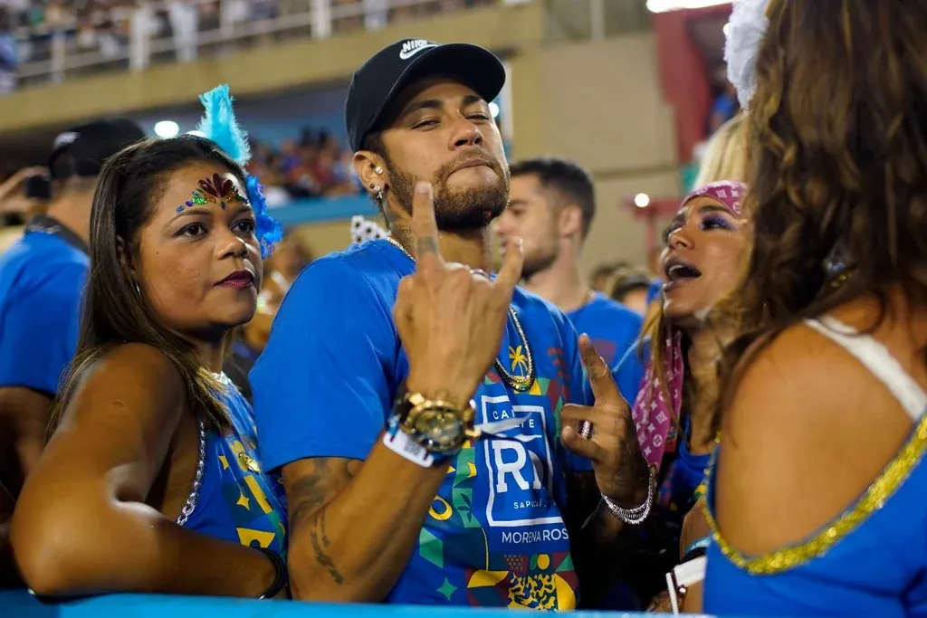 Neymar llegó al sambódromo acompañado de la popular cantante Anitta, la actual reina del pop en Brasil, y del bicampeón mundial de surf Gabriel Medina, un viejo amigo, así como de otros amigos, que ocuparon una sala reservada en el "camarote".