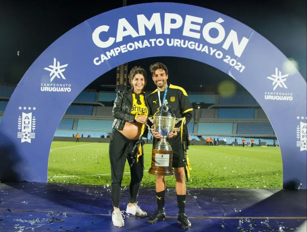 Su esposa Renata se encuentra a su vez embarazada y festejó con él el título del Uruguayo el pasado martes en el Estadio Centenario.