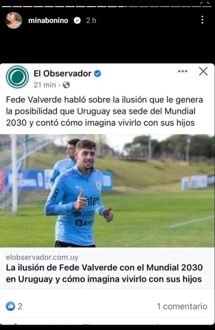 Mina Bonino, la pareja de Federico Valverde, reaccionó con humor al ver en El Observador las declaraciones que hizo el futbolista sobre cómo se imaginaba vivir el Mundial 2030 en caso de que se realice en Uruguay, Argentina, Chile y Paraguay.
