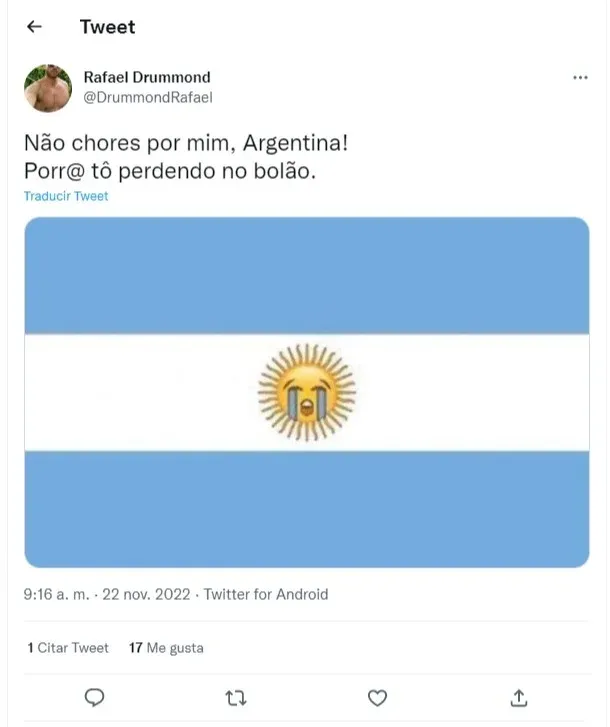 Otro puso una foto suya sonriendo, vestido con la camiseta verdeamarilla de Brasil, con la frase de la famosa canción "No llores por mí, Argentina".