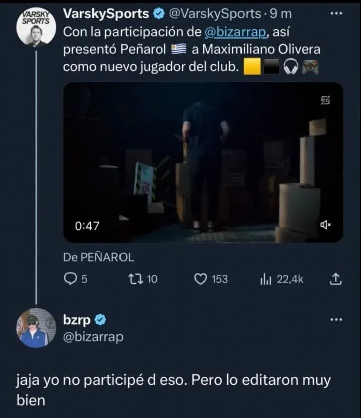 La presentación de Maxi Olivera que hizo Peñarol utilizando la imagen de Bizarrap fue comentada por el productor musical argentino y también generó la reacción de la pareja de un jugador de Nacional.