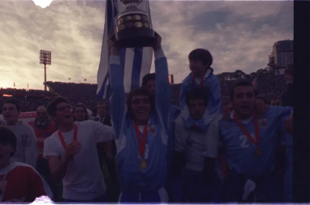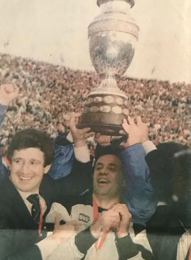 Fernando Morena festeja la Copa América 1995 junto a Fernando Álvez