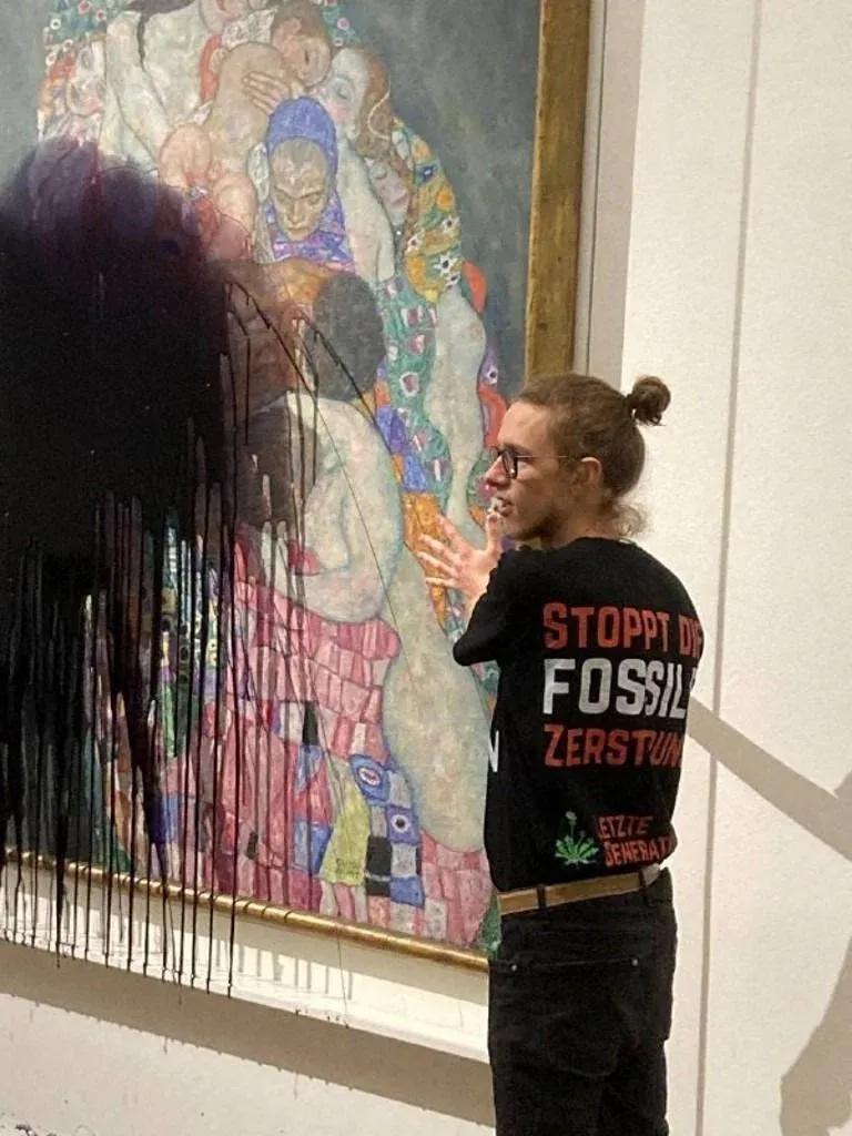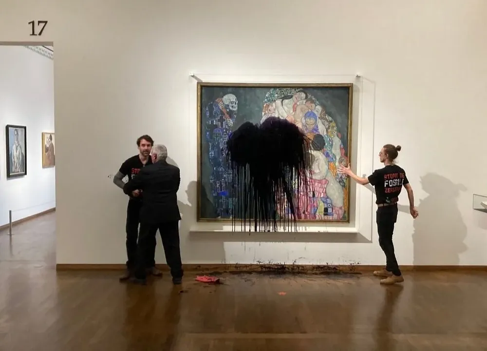 Activistas ecologistas rociaron este martes con un líquido negro y oleoso el famoso cuadro Muerte y vida del pintor austríaco Gustav Klimt, informó el Museo Leopold de Viena.