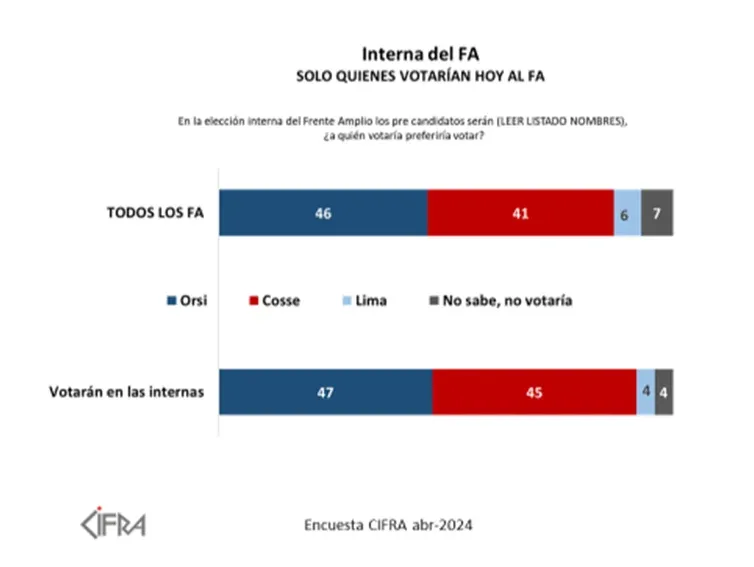 Para Cifra, entonces, en el Frente Amplio Orsi y Cosse "están casi empatados". "El resultado dependerá de cómo se desempeñen en estos últimos dos meses y también de cuántos frenteamplistas efectivamente participen en la elección. En principio, mayor participación beneficiaría a Orsi, que tiende a atraer a los menos militantes, mientras que una interna más chica beneficiaría a Cosse", afirma la investigación.