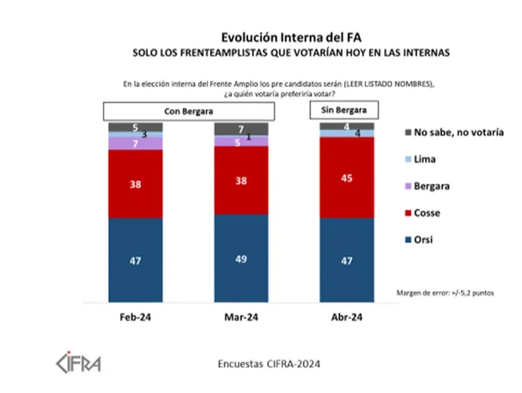 La consultora Cifra presentó este lunes en Telemundo (Canal 12) una nueva encuesta de intención de voto a la interna de cada uno de los partidos, a falta de dos meses de las elecciones internas que se celebrarán el último domingo de junio.