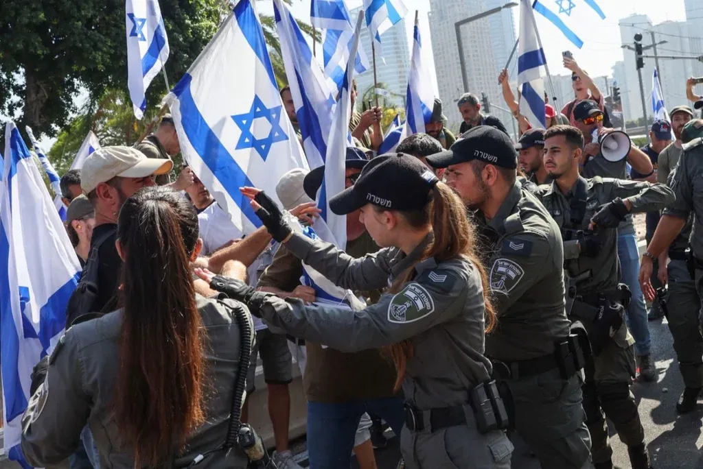 Desde las 06:30 locales, una multitud de manifestantes confluyó hacia la plaza Habima en el centro de Tel Aviv, agitando banderas israelíes y cantando eslóganes contra la reforma,
