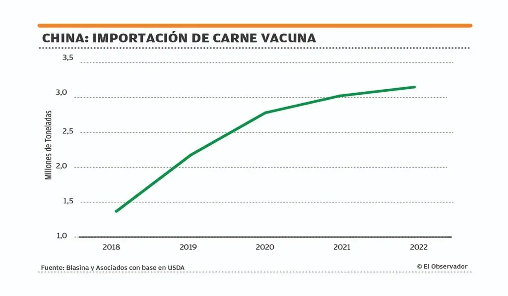 Se espera que China importe 3,15 millones de toneladas de carne vacuna en 2022, el mayor volumen en su historia, aunque el ritmo de crecimiento se frena notoriamente respecto a los últimos cinco años.