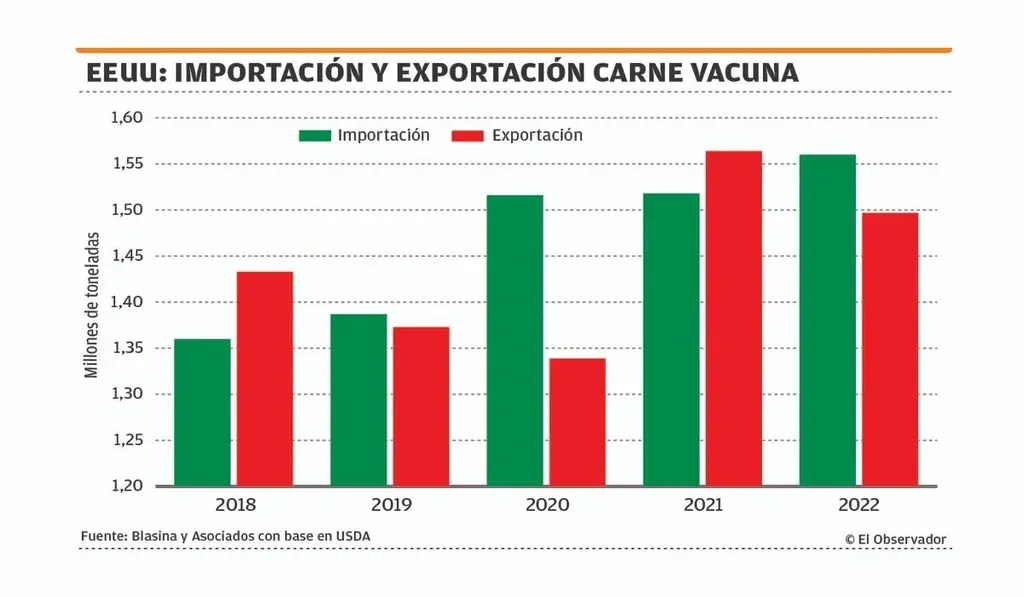 Estados Unidos está en una situación compleja. La producción de carne será menor que en 2021 y deberá importar unas 80 mil toneladas más que el año pasado –Uruguay le vendió 70 mil toneladas– para satisfacer el consumo interno. La sequía que afecta a las zonas del oeste, donde pasta el 80% del ganado estadounidense, llevó a una intensa faena que reducirá el stock a niveles de 2014 y el precio récord de los granos limita las posibilidades de rentabilidad del engorde a corral.