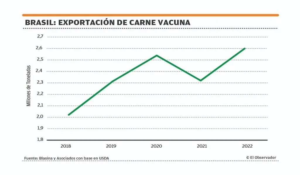 Las exportaciones de Brasil pasarán de 2,32 millones de toneladas en 2021 a 2,6 millones este año, por la mayor disponibilidad de ganado, la normalización de la demanda de China y una mejor rentabilidad de los frigoríficos que impulsará un aumento de 4% en la producción de carne vacuna.