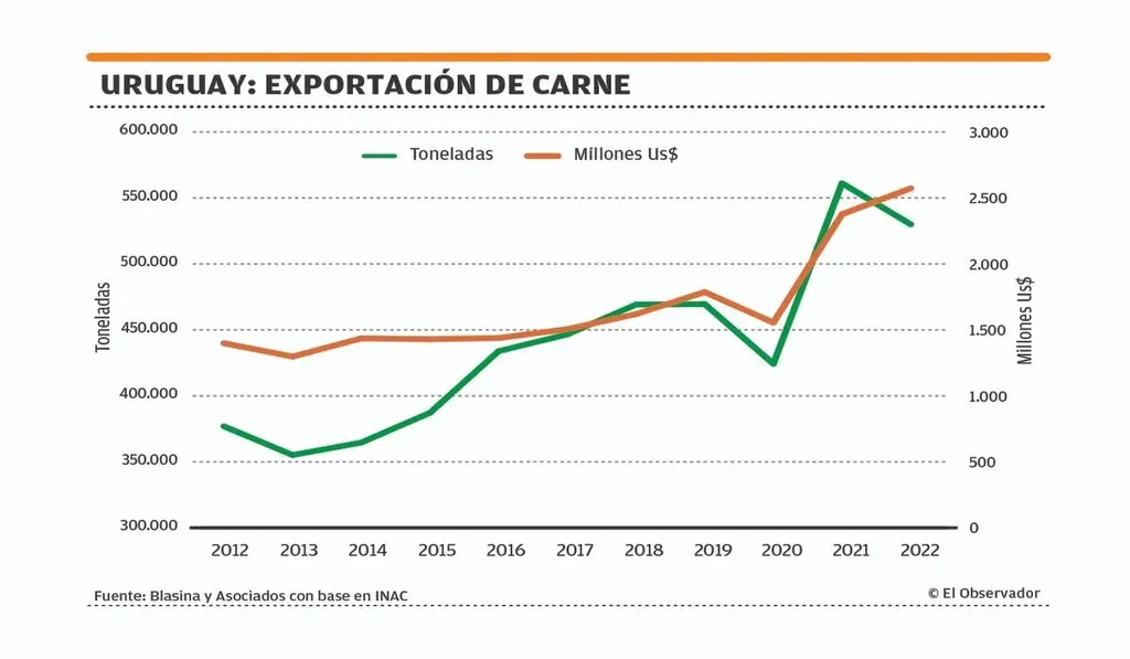 Las proyecciones sobre el mercado internacional de carne que el Departamento de Agricultura de Estados Unidos (USDA) divulgó el 8 de abril ubican a las exportaciones del presente año de Uruguay en 530 mil toneladas, 31 mil toneladas –o 5,5% menos– que en 2021. Pero la proyección de abril corrige hacia arriba a la realizada anteriormente, probablemente con base en las fuertes ventas de Uruguay en el primer trimestre de este año.