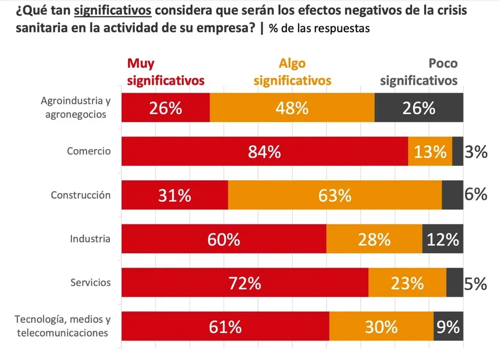 En línea con otros indicadores ya publicados, las empresas vinculadas al sector de comercio y servicios son las que esperan tener el mayor impacto por la crisis generada por el coronavirus y la consecuente reducción de la movilidad. La agroindustria, los agronegocios y la construcción, en tanto, tendrán un impacto menor, según proyectan los ejecutivos de estas empresas.