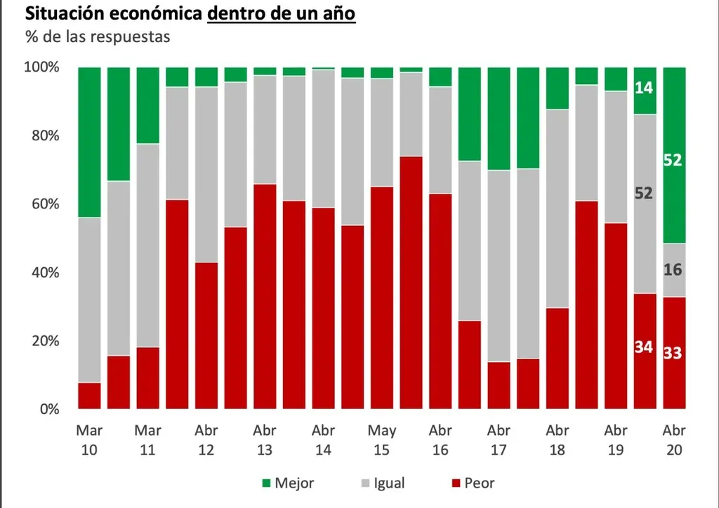 En octubre de 2019, el 36% de los consultados creía que el nuevo gobierno haría cambios en la política salarial mientras que en abril de 2020 ese número aumenta a 58%. Respecto a la inserción internacional el aumento es de 54% a 71%.