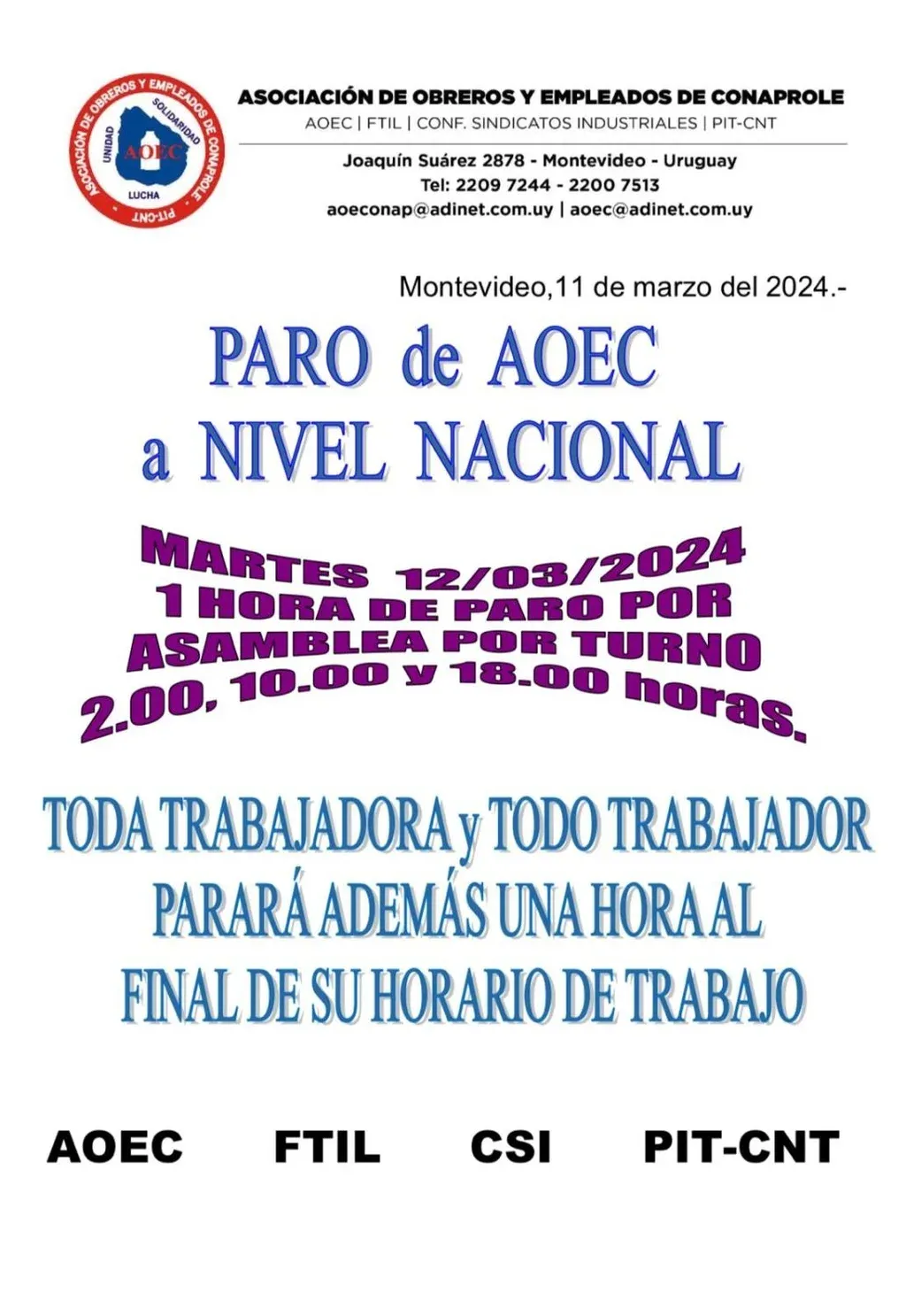 Habrá una hora de paro por asamblea en cada turno (a las horas 2, 10 y 18) y además una hora de paro al cierre de cada jornada laboral por trabajador.