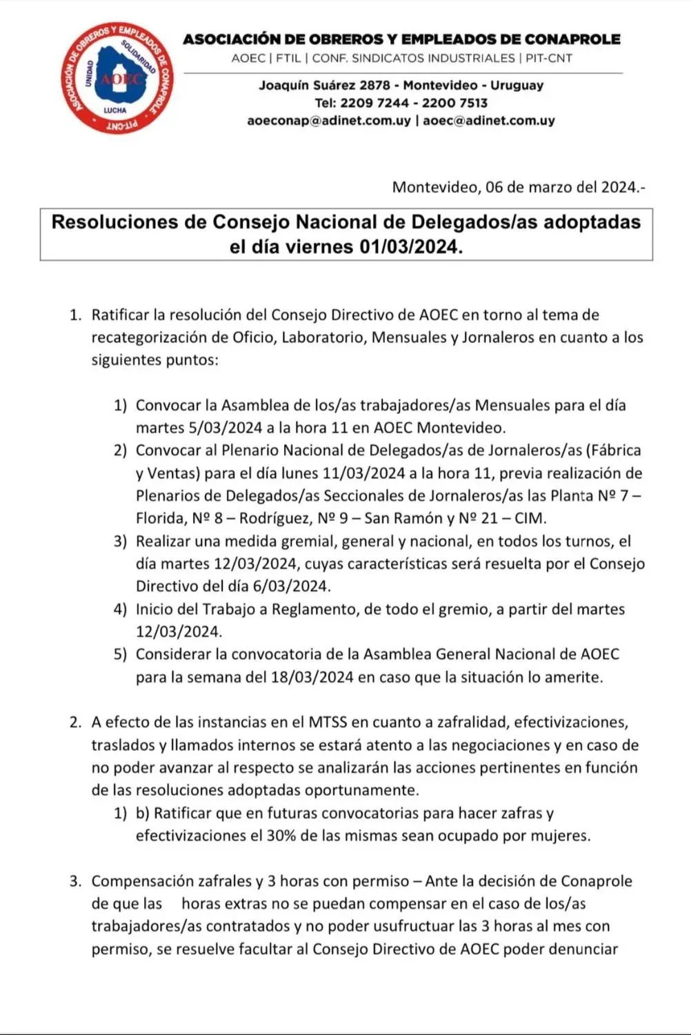 En una reunión del Consejo Nacional de Delegados de AOEC se decidió también convocar a distintos ámbitos de decisión sindical y activar desde este martes 12 la medida de trabajo a reglamento.