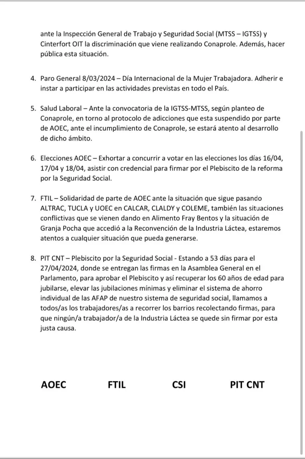 Añadió que eso fue hablado en la ronda de los consejos de salarios de 2022, donde se afirmó expresamente, en la cláusula de paz, que desde agosto de 2022 hasta noviembre de 2023 no podía haber conflictos por las categorías, pero a partir de diciembre del año pasado quedaban liberados de lo indicado en la cláusula, independientemente de que el acuerdo decía que en todo ese período las partes podían reunirse, cosa que intentamos varias veces con la empresa y no se pudo hacer, incluso volvimos a insistir desde diciembre, y como no se avanzó y Conaprole sigue cerrado a generar estos espacios es que iniciamos el trabajo a reglamento".