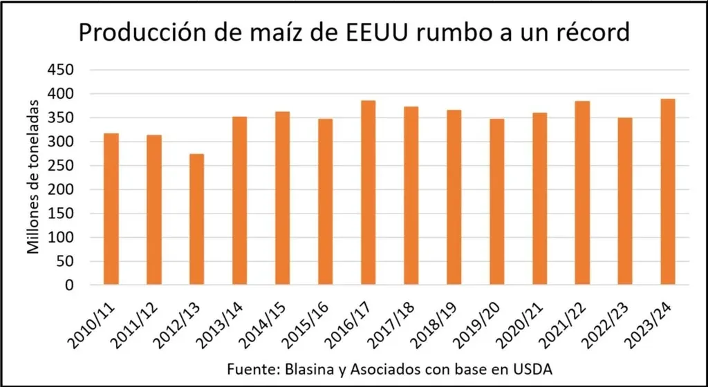 El stock de maíz estadounidense daría un salto de 36 a 56 millones de toneladas, y eso mantendría la referencia de precios moderada en 2024.