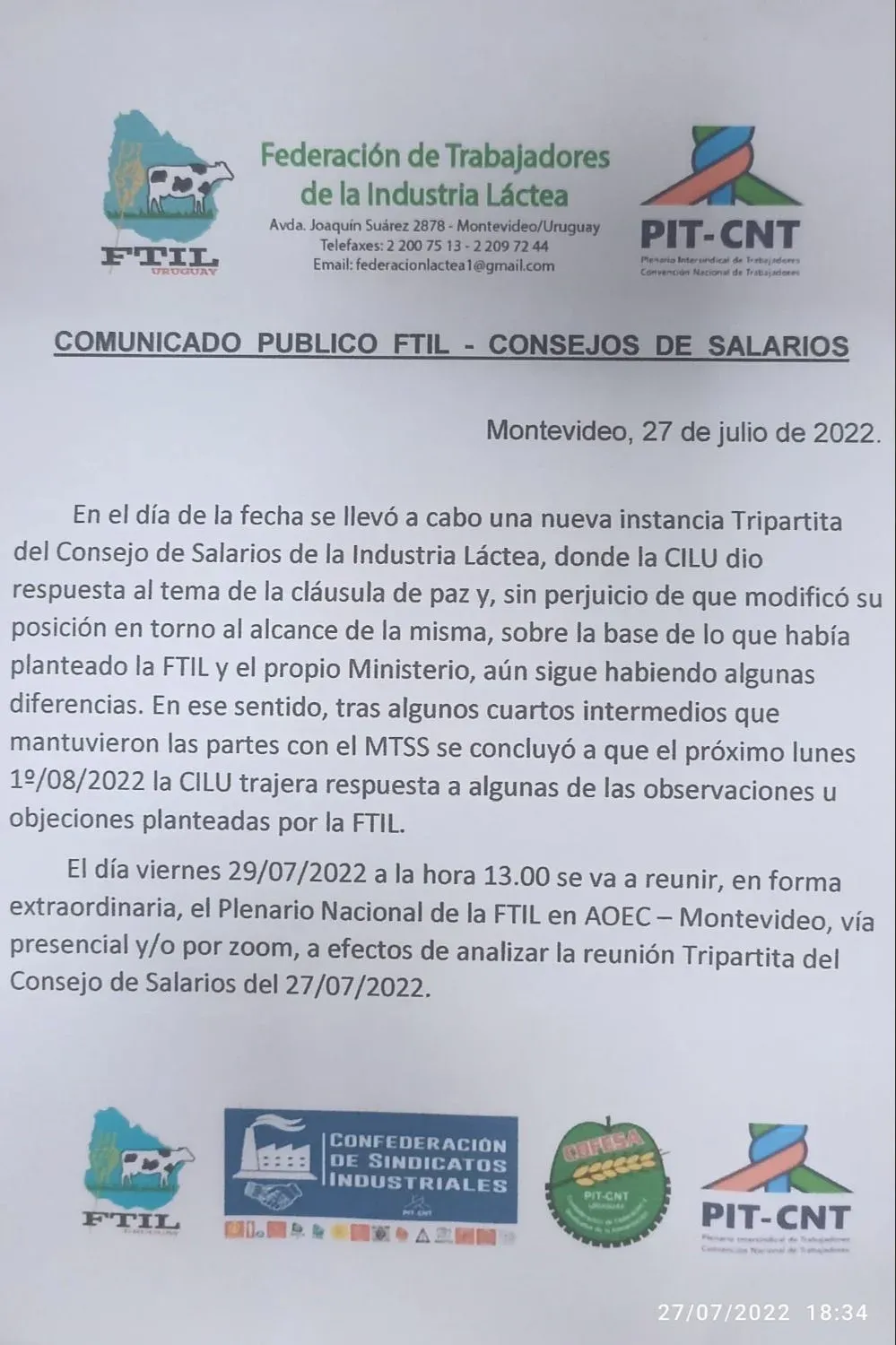 Previo al comunicado de la cámara empresarial se había conocido uno de la Federación de Trabajadores, en el que se informa que este viernes 29 de julio, a la hora 13, habrá un plenario nacional de la FTIL en la sede de la Asociación de Obreros y Empleados de Conaprole (AOEC), para analizar lo considerado en la reunión tripartida de esta semana.