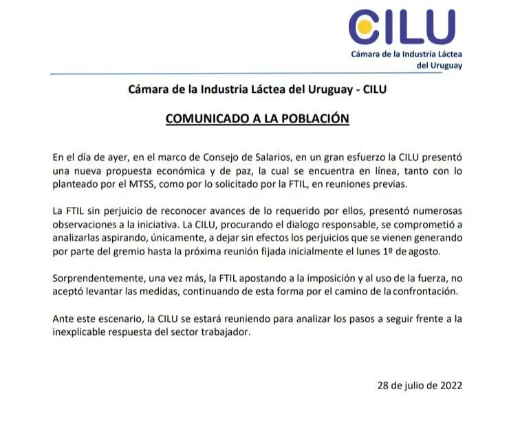 La Cámara de la Industria Láctea del Uruguay (CILU) expuso su malestar con relación a una reciente actitud de la Federación de Trabajadores de la Industria Láctea (FTIL).