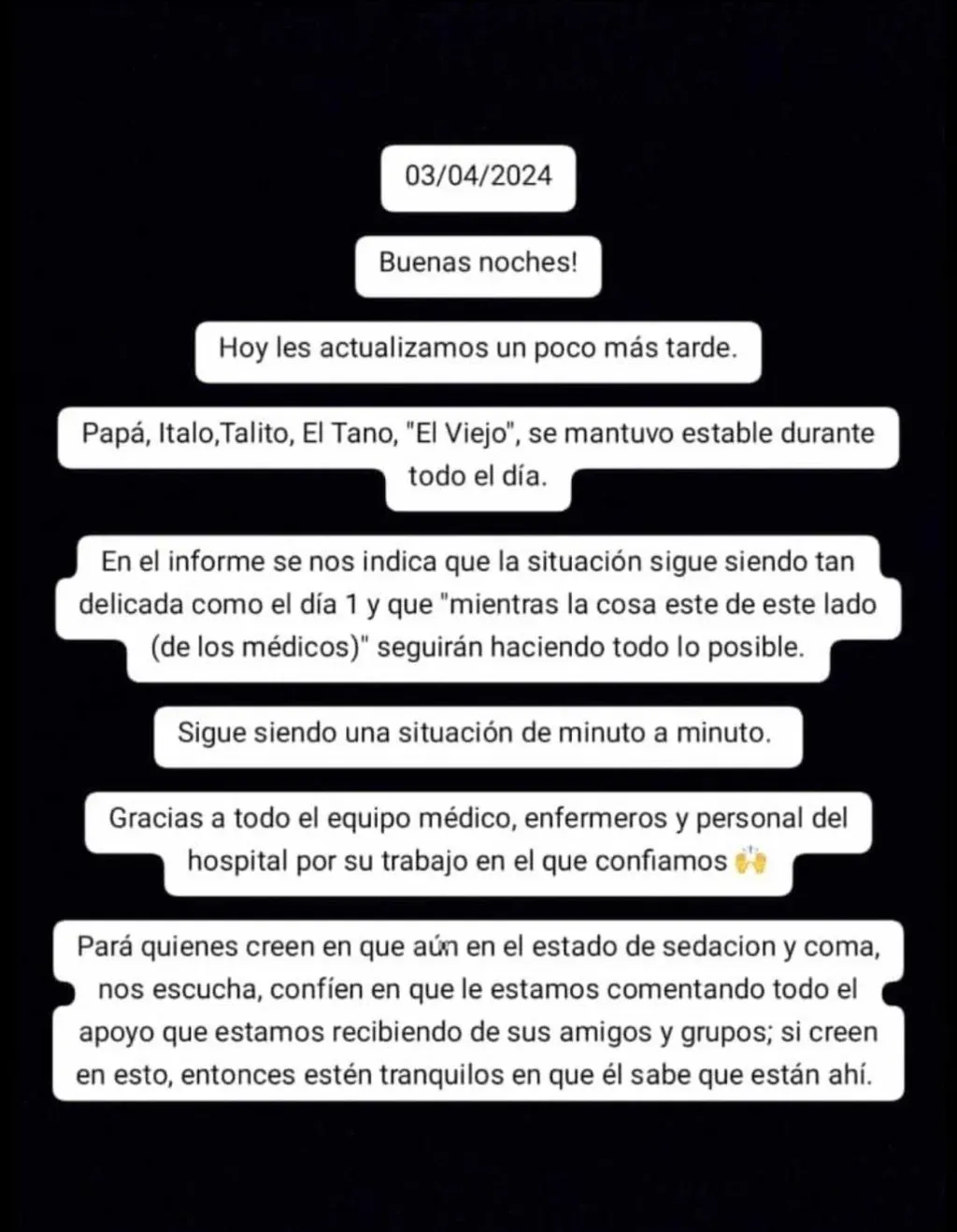Agregan que "sigue siendo una situación de minuto a minuto", y que se encuentra en estado de sedación y coma.