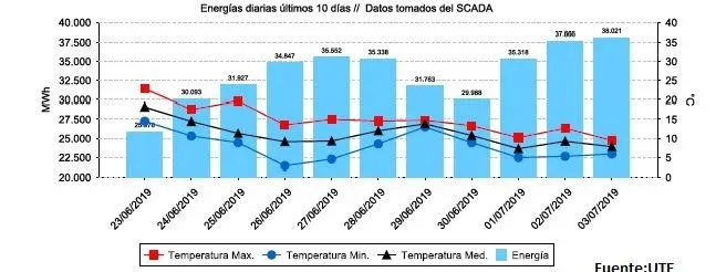 El miércoles 3 de julio registró la mayor demanda de energía en lo que va del invierno con 38.021 megawatthora (MWh). Esta marca superó a los 37.666 MWh que se habían alcanzado el martes, según datos del Despacho Nacional de Cargas publicados por UTE
