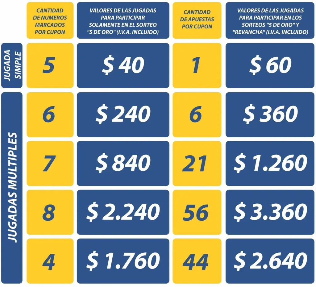 El valor de la apuesta para participar del Pozo de Oro y Revancha es de $60, mientras que para participar solamente en el del 5 de Oro el valor es de $40.