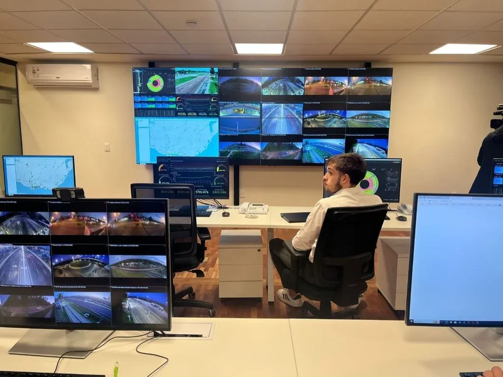 En la oficina de Monitoreo la pantalla gigante muestra varias subpantallas pequeñas con las imágenes de los radares en tiempo real. Y, además, otras pantallas muestran el software que miden los tiempos promedio de viaje entre determinados tramos o congestiones en las rutas.