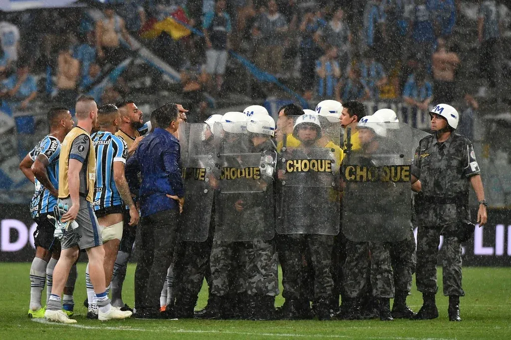 AFP Los jugadores de Gremio le reclaman a Andrés Cunha y sus asistentes El arquero del equipo tricolor, Marcelo Grohe, dijo: "desafortunadamente tuvimos el penal en contra por el VAR y no se tiene que discutir". "El árbitro dijo penal, entonces, paciencia", agregó.