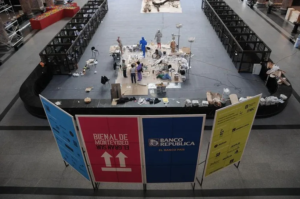 Los artistas van y vienen en el hall principal de la central del Banco República (BROU) en Ciudad Vieja. Hay olor a pintura y a enduido, troncos por el piso, una canoa naranja que cuelga en la pared, cientos de pelotas de colores dentro de un volumen con forma de cruz y, sobre todo, una energía diferente a la que habitualmente se vive en una institución financiera.
