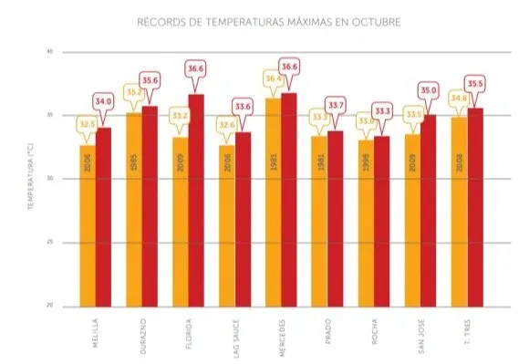 Con los registros obtenidos desde 1981 hasta hoy, Inumet concluyó que en nueve estaciones de monitoreo se registraron temperaturas récord el mes pasado. La siguiente gráfica representa los valores máximos históricos (color naranja) por estación y el valor récord de temperatura máxima de octubre de 2021 (color rojo) de las nueve estaciones en donde se registraron valores récord. El período registrado en las estaciones Melilla y Florida es el 1991-2020, y el de Laguna del Sauce y San José es el 2000-2020.