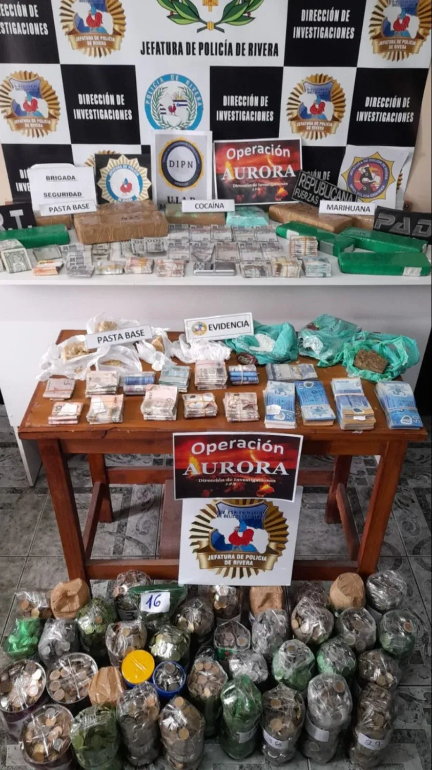En el marco de la operación Aurora, la policía de Rivera realizó 16 allanamientos en la capital del departamento; entre las personas detenidas se encuentra un efectivo policial, informó Telemundo y confirmó El Observador con fuentes de la jefatura. Además incautaron pasta base, marihuana y cocaína.