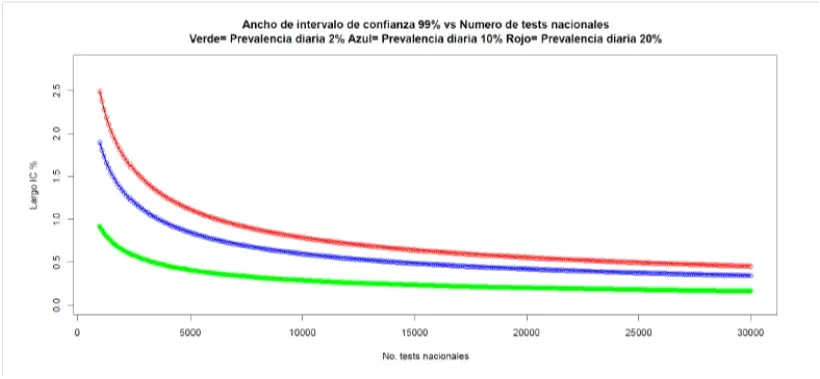 Figura 1. Anchos de intervalos de confianza en función del número de tests practicados en tres escenarios de prevalencia, suponiendo muestro estratificado.