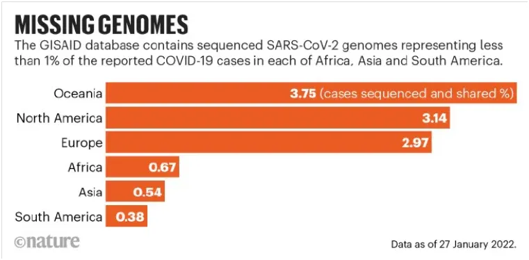 No es sorprendente que los países con mayores recursos y con importante inversión en investigación, ciencia, tecnología y desarrollo, sean los que hayan secuenciado más muestras. GISAID (https://www.gisaid.org/) es una organización con foco original en la influenza, con sede en Alemania y con financiamiento por parte de los EEUU y Singapur. Según el artículo de Nature que comentamos5, 7.5 millones de secuencias de SARS-CoV-2 fueron entregadas a la base de datos de GISAID, pero cientos de millones de casos no han podido ser secuenciados. Sud-África, por ejemplo, ha entregado 28,000 genomas a GISAID, pero hizo secuencias en menos de 1% de sus propios casos. Muchos países, como Tanzania, Zimbabue y Mozambique, han enviado menos de 1,000 secuencias a GISAID.
