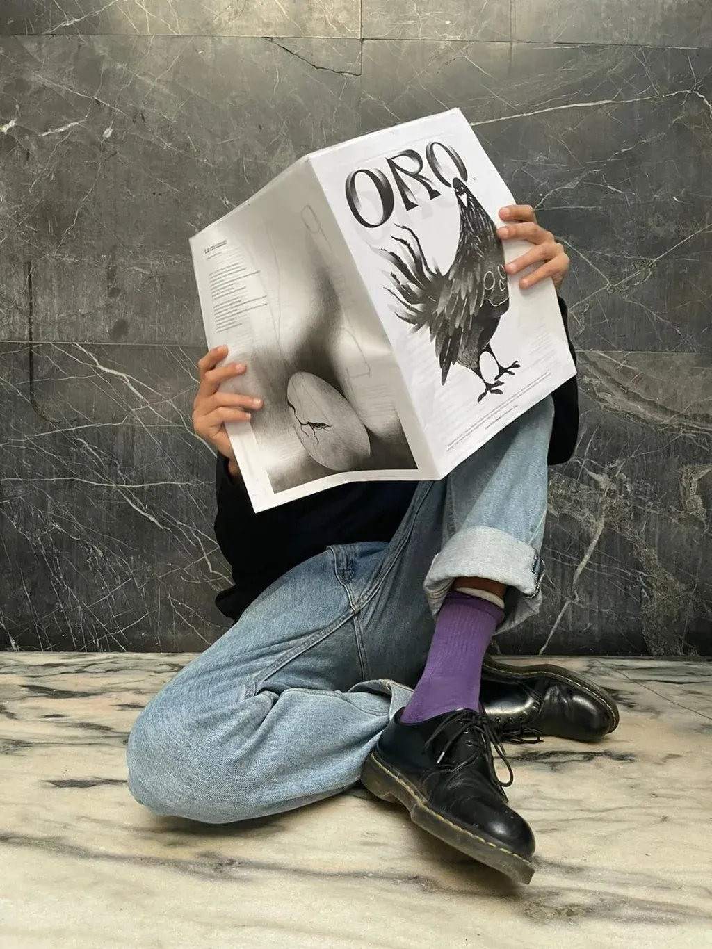 No hay declaración de principios, ni bienvenida, ni editorial, solo una suerte de puerta: un gallo gigantesco, en escala de grises, que se para orgulloso bajo la tipografía y que le da paso a la literatura. Porque esa es, sin demasiadas vueltas, la intención de Oro: que la zambullida sea directamente en los textos, que nada prepare al lector, que el impacto contra el papel (de diario) sea como darse la cara contra las baldosas, pero manteniendo la sonrisa intacta, esa que se produce cuando el encuentro con la primera revista literaria uruguaya impresa en mucho tiempo —una que aparece como una suerte de vaso de agua no salada en medio de un desierto inundado por OSE— se da.