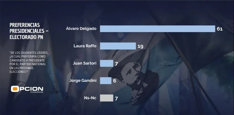 "En la primera medición realizada a posteriori de la confirmación y el lanzamiento de la precandidatura de Álvaro Delgado (quien ya ha renunciado a su cargo de Secretario de Presidencia), se registra su mayor volumen histórico de preferencias dentro del electorado nacionalista, 61%. Delgado cuenta actualmente con la mayor distancia sobre Laura Raffo, quien invariablemente ha ocupado el segundo lugar de preferencias en la grilla nacionalista", señala el análisis.