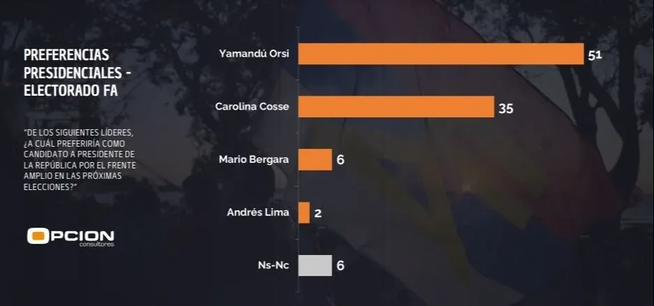 Orsi lidera la interna del Frente Amplio (FA) con el 51% de la intención de voto, seguido por Carolina Cosse con el 35%. En tercer lugar aparece Mario Bergara con 6% y Andrés Lima con 2%.