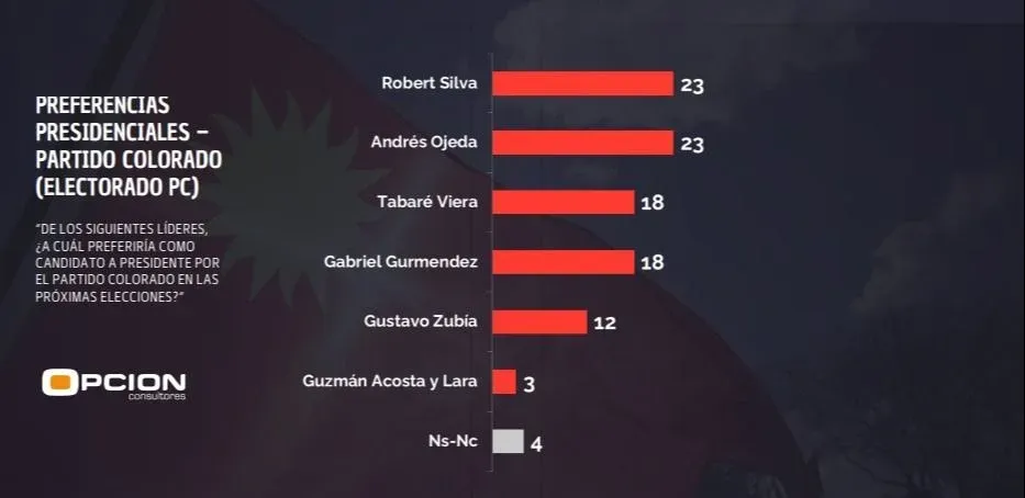 "Pasando raya a los resultados de ambas estrategias de medición, queda claro que no hay líderes colorados que obtengan ventajas apreciables y que el escenario está totalmente abierto entre al menos cuatro de los seis precandidatos evaluados, más allá que Robert Silva y Andrés Ojeda (en ese orden) estarían comenzando con cierta ventaja de posicionamiento. Además, si la interna del PC es relativamente acotada en volumen, cobrará más relevancia la estructura de militancia y dirigencia de los precandidatos en los departamentos más relevantes para la votación, un aspecto que es complejo de registrar con precisión en las encuestas de opinión pública", señala el análisis.
