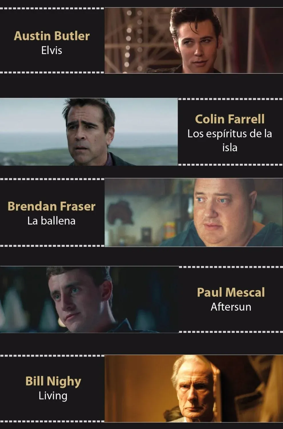 Brendan Fraser, La ballena: con su interpretación de un profesor homosexual obeso recluido en su casa, el actor tuvo su regreso triunfal luego de más de una década alejado de los focos, motivada por una depresión provocada por lesiones físicas, pérdidas familiares y una situación que lo tuvo como víctima de abuso sexual. Esa narrativa, sumada a su emotiva respuesta a reconocimientos y galardones que ha recibido en el camino al Oscar, se han combinado a su emotivo trabajo en la película de Darren Aronofsky para garantizarle un lugar en esta categoría, aún cuando la película fue polémica y divisiva.