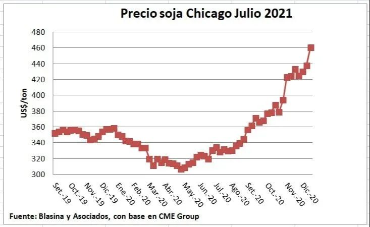 De ese modo, en Chicago la primera posición de la soja llegó a US$ 466 por tonelada, y el trigo de la próxima cosecha uruguaya, la de 2021, cruzó los US$ 230 y llegó a US$ 232.