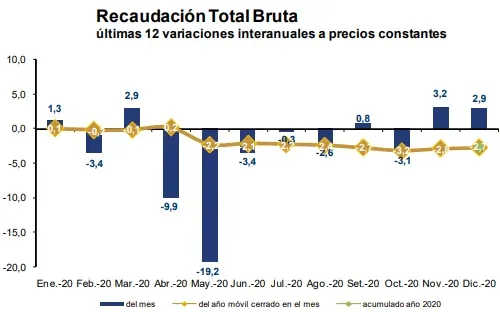 La recaudación total bruta viene mostrando tanto variaciones interanuales positivas como negativas en el período enero 2020-diciembre 2020. En el acumulado de los últimos 12 meses la variación interanual fue de - 2,7%.