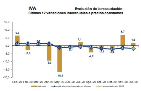 La recaudación del IVA alcanzó los $ 17.866 millones en diciembre, representando de esta forma el 44,7% de la recaudación total bruta. En diciembre la variación real fue de 1,6% mientras que, la variación real del año móvil cerrado a dicho mes fue de -1,7%.