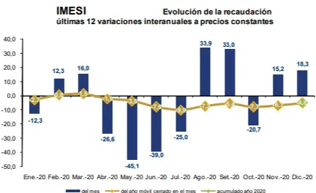 Por su lado, la recaudación del Imesi alcanzó los $ 4.744 millones en diciembre 2020, representando de esta forma el 11,9% de la recaudación total bruta. En particular, en el pasado mes la variación real para este impuesto fue de 18,3%, mientras que la variación real del año móvil cerrado a dicho mes fue de -4,8%.