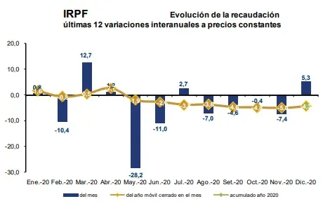 En tanto, la recaudación del IRPF alcanzó los $ 7.477 millones (18,7% del total). En diciembre la variación real fue de 5,3% mientras que en el año móvil cayó -4,3%. Cabe aclarar que el primer día hábil de diciembre 2020 se recibió recaudación que debió ingresar en noviembre. Corrigiendo este efecto de caja, la variación interanual real hubiese sido menor a la observada (1,2% en vez de 5,3%), explicó la DGI.