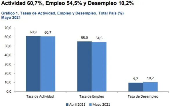 En tanto, la tasa de desempleo se ubicó en 10,2% en mayo, lo que representa 0,5 puntos porcentuales más que abril (9,7%). Así, el número de desocupados se ubicó en unos 180 mil, unos 8.000 por encima de abril.